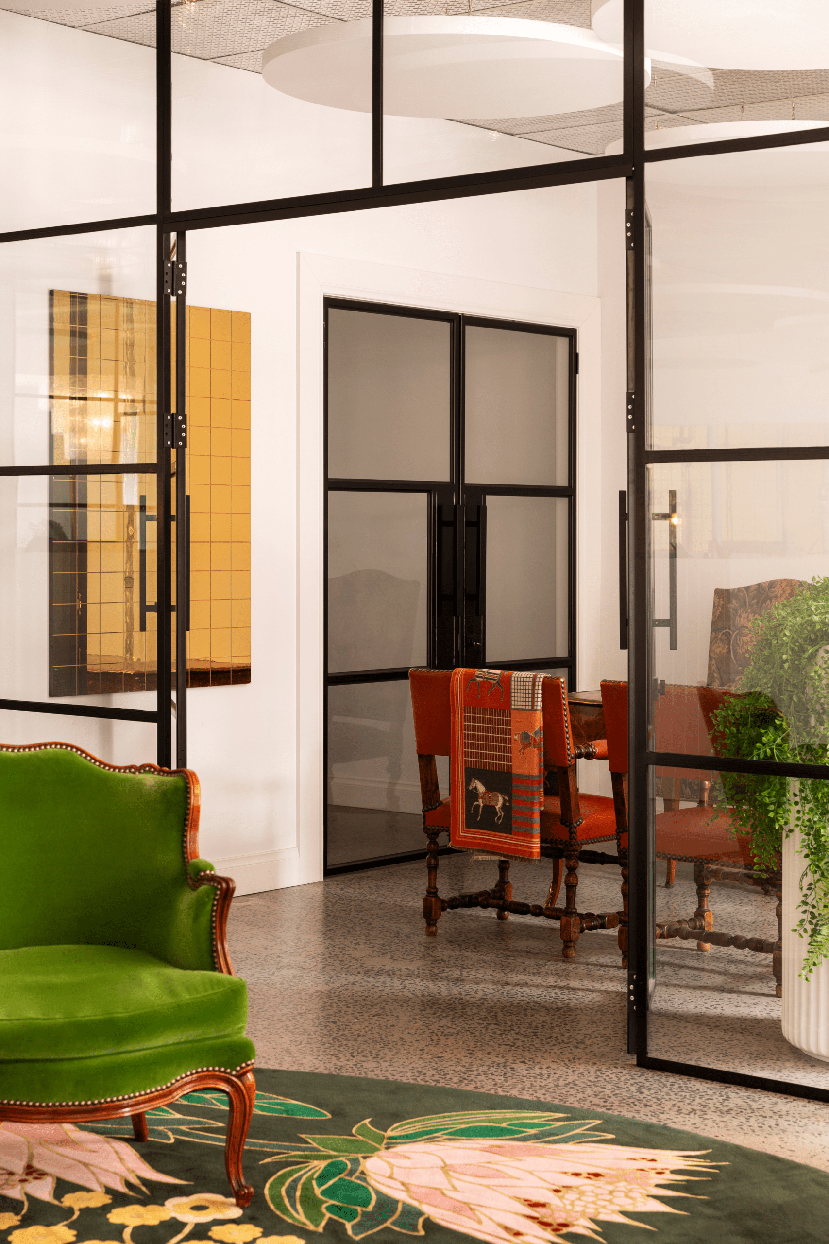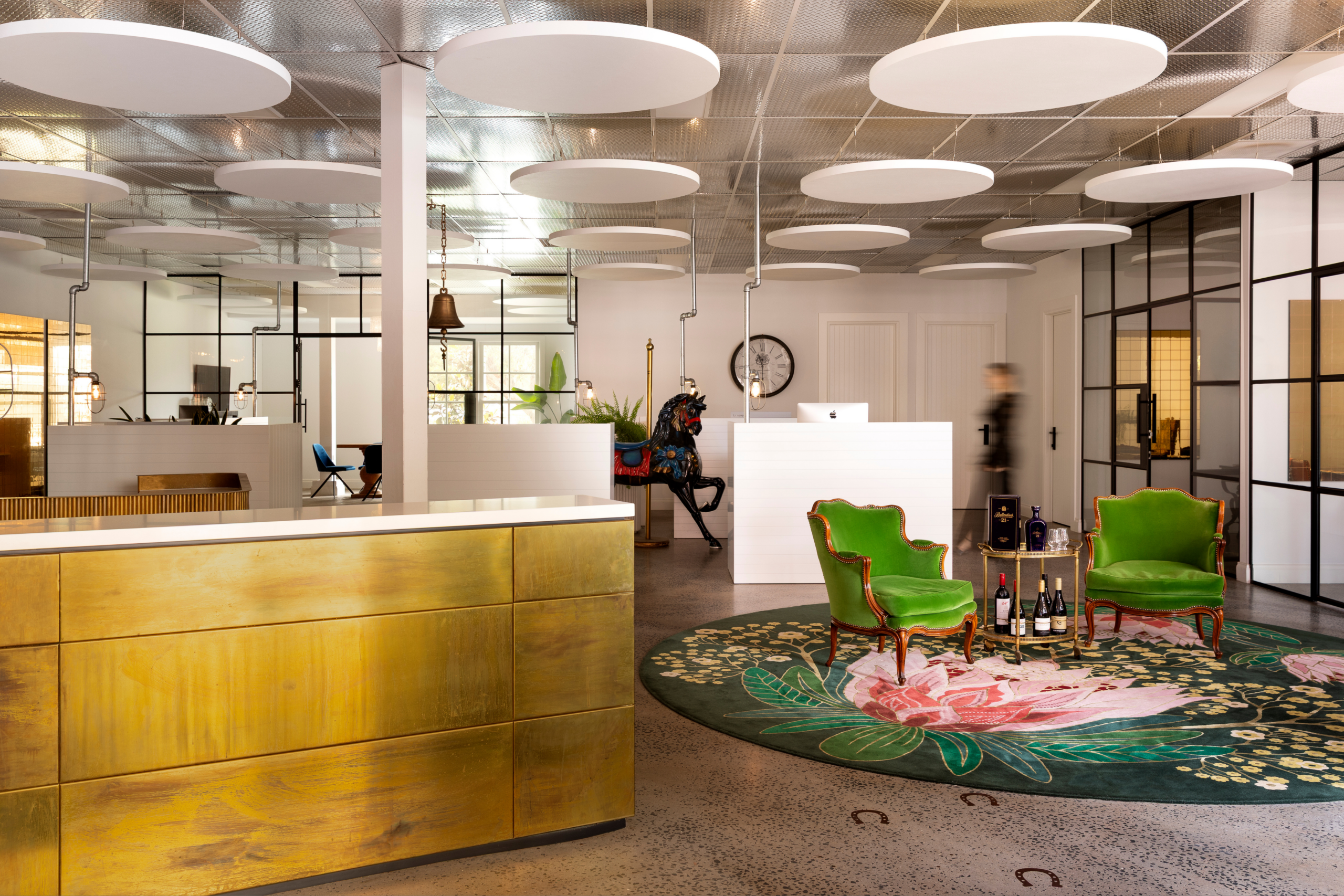Metallic grated sheets were cut to brighten the ceiling, glassed walls divided work spaces without dividing people, concrete floors were ground and buffed whilst brilliantly coloured rugs and furniture softened acoustics. Space was limited and every piece had a reason.